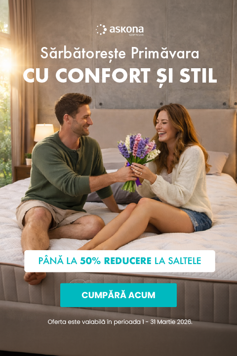 De aceea, misiunea Askona este să îți ofere soluții complete pentru un somn sănătos, adaptate nevoilor tale și stilului tău de viață. Fie că alegi o saltea ortopedică, un pat modern sau accesorii pentru confort, te bucuri de produse testate, fiabile și concepute pentru bunăstare. La Askona, calitatea somnului tău este întotdeauna pe primul loc.
