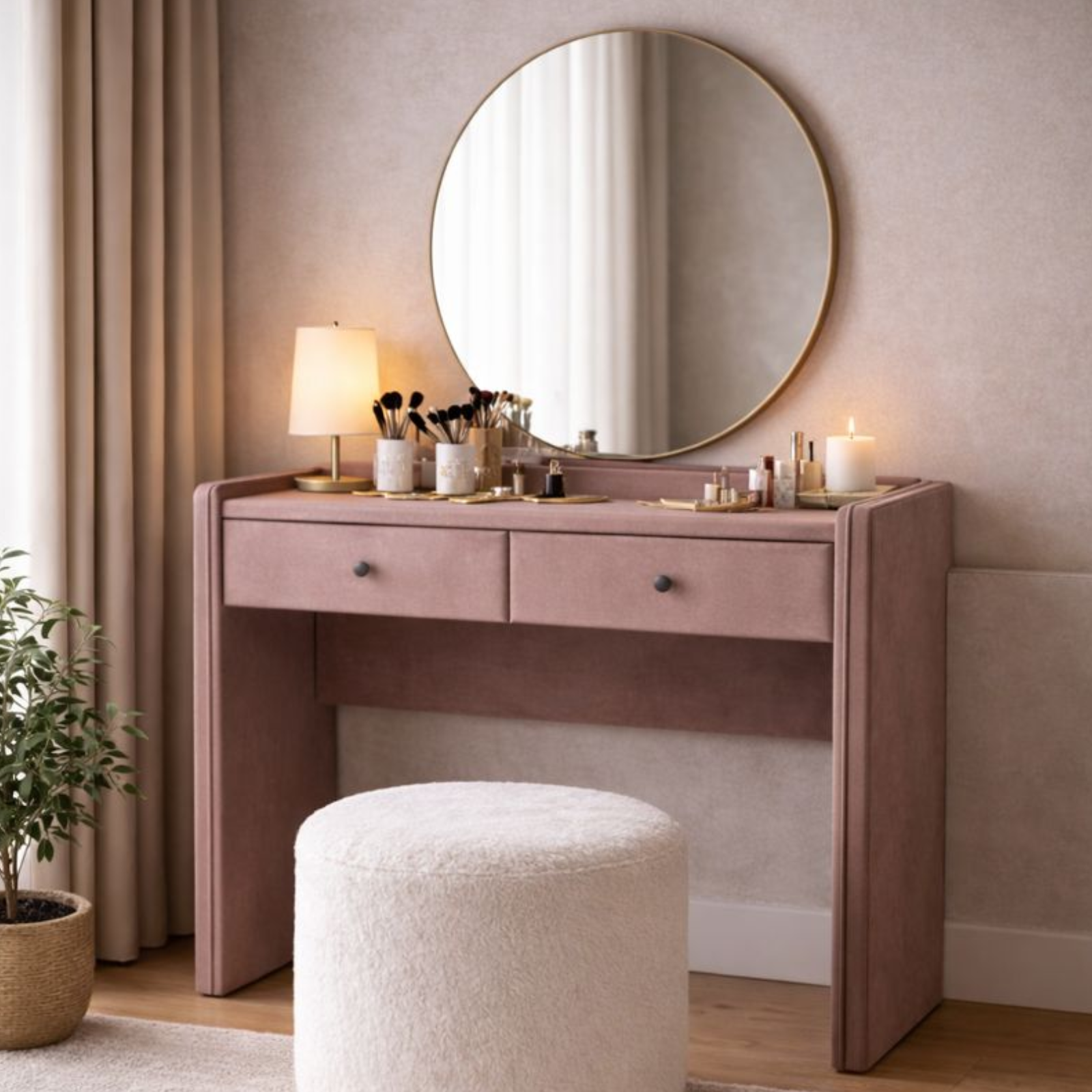 Măsuța de machiaj Tivoli este o piesă rafinată, creată pentru a aduce funcționalitate și stil în zona ta de beauty. Designul său elegant, cu linii fluide și detalii laterale atent conturate, oferă un aspect sofisticat și aerisit. Cele două sertare practice permit organizarea eficientă a produselor de machiaj, bijuteriilor sau accesoriilor, păstrând blatul liber și ordonat. Disponibilă într-o varietate de culori și materiale, măsuța de machiaj Tivoli completează armonios amenajarea, oferind un spațiu dedicat rutinei tale zilnice de îngrijire.