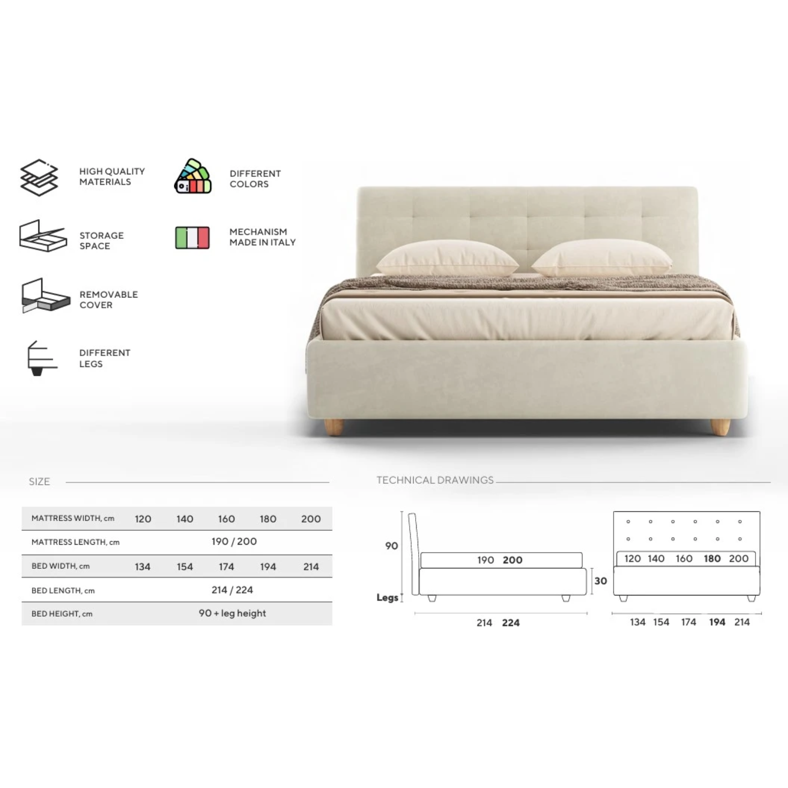 Lungime 190/200 - Adâncimea utilă a spațiului de depozitare: 15 cm;