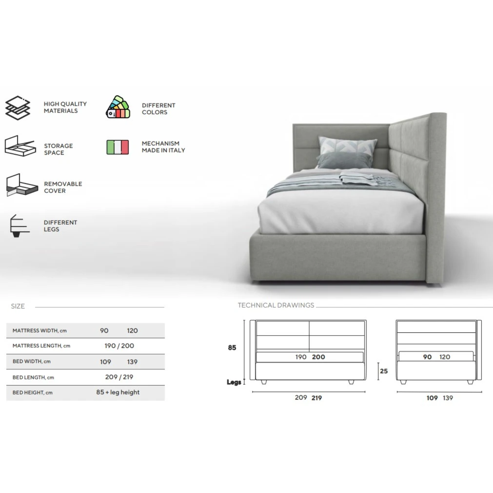 - Husă detașabilă pe lateralul patului;