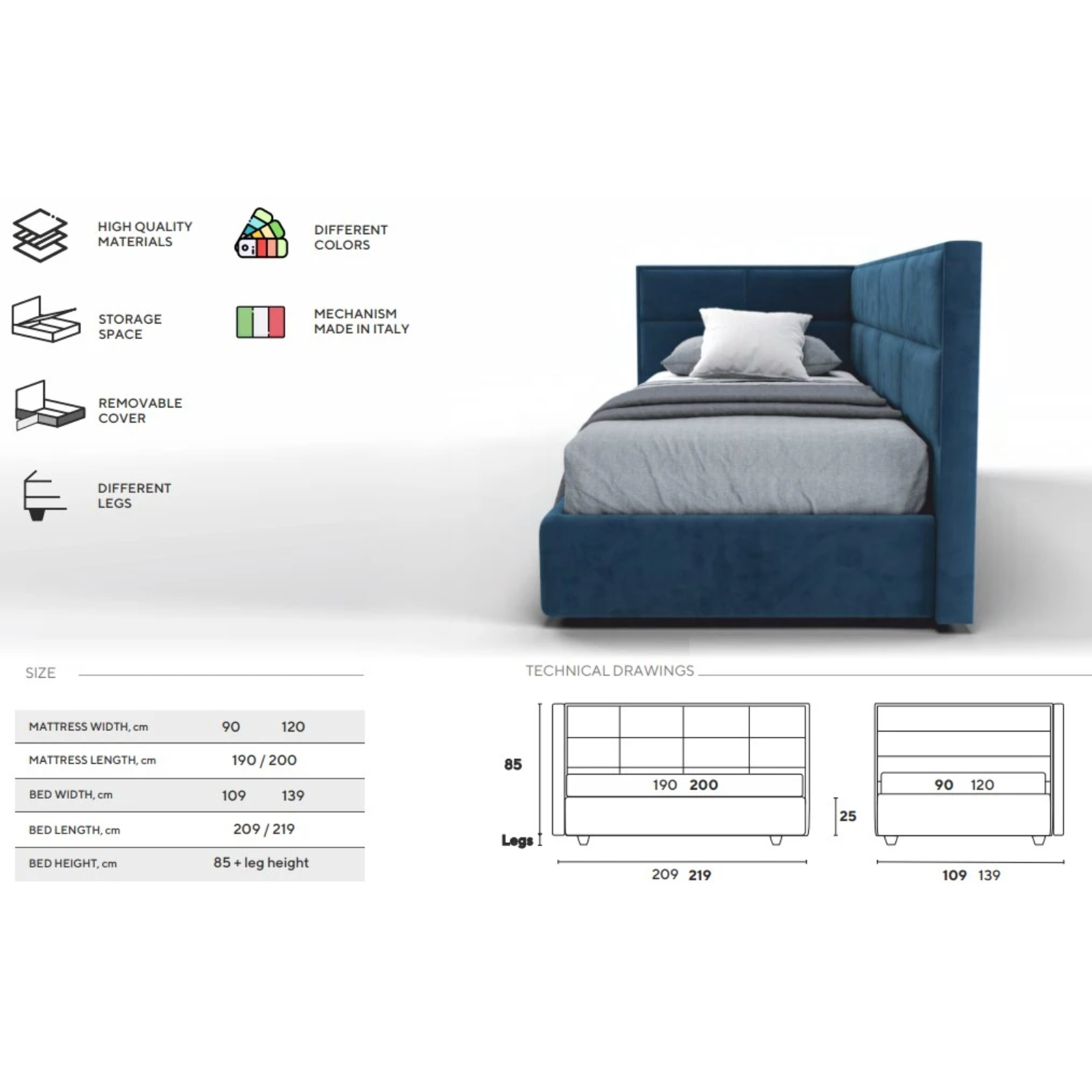 Lungime 190/200 - Adâncimea utilă a spațiului de depozitare: 15 cm;