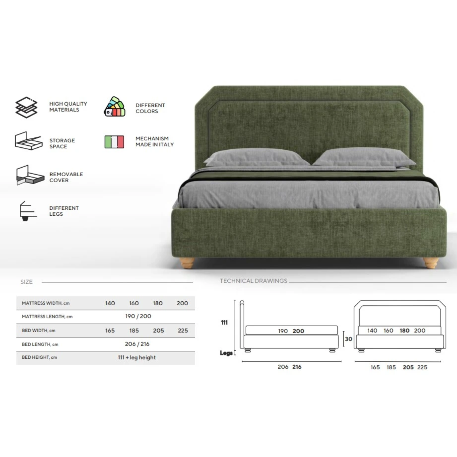 • Patul vine cu picioare standard Chrome de 5/8/10 cm (cilindrice din metal argintiu). Alte optiuni sunt contra cost.