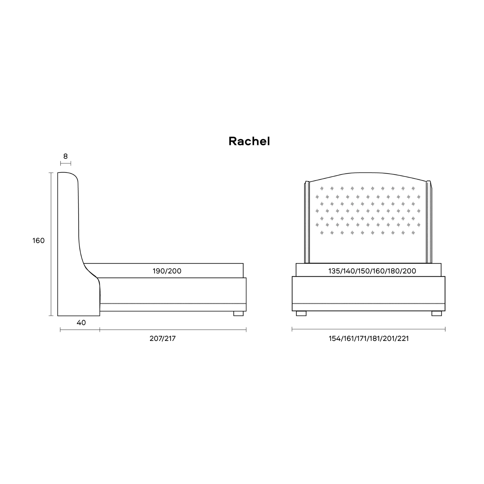 Eleganța și confortul au fost îmbinate în patul Rachel. Tăblia înaltă și moale creează o senzație specială de calm și siguranță pe tot parcursul somnului.