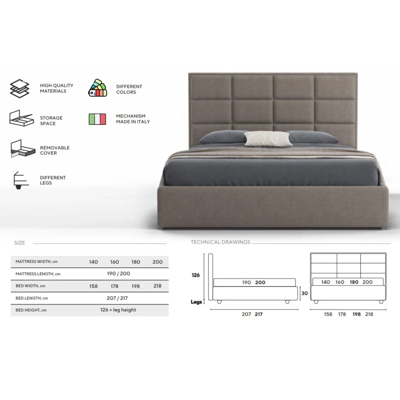 Lungime 190/200 - Adâncimea utilă a spațiului de depozitare: 15 cm;