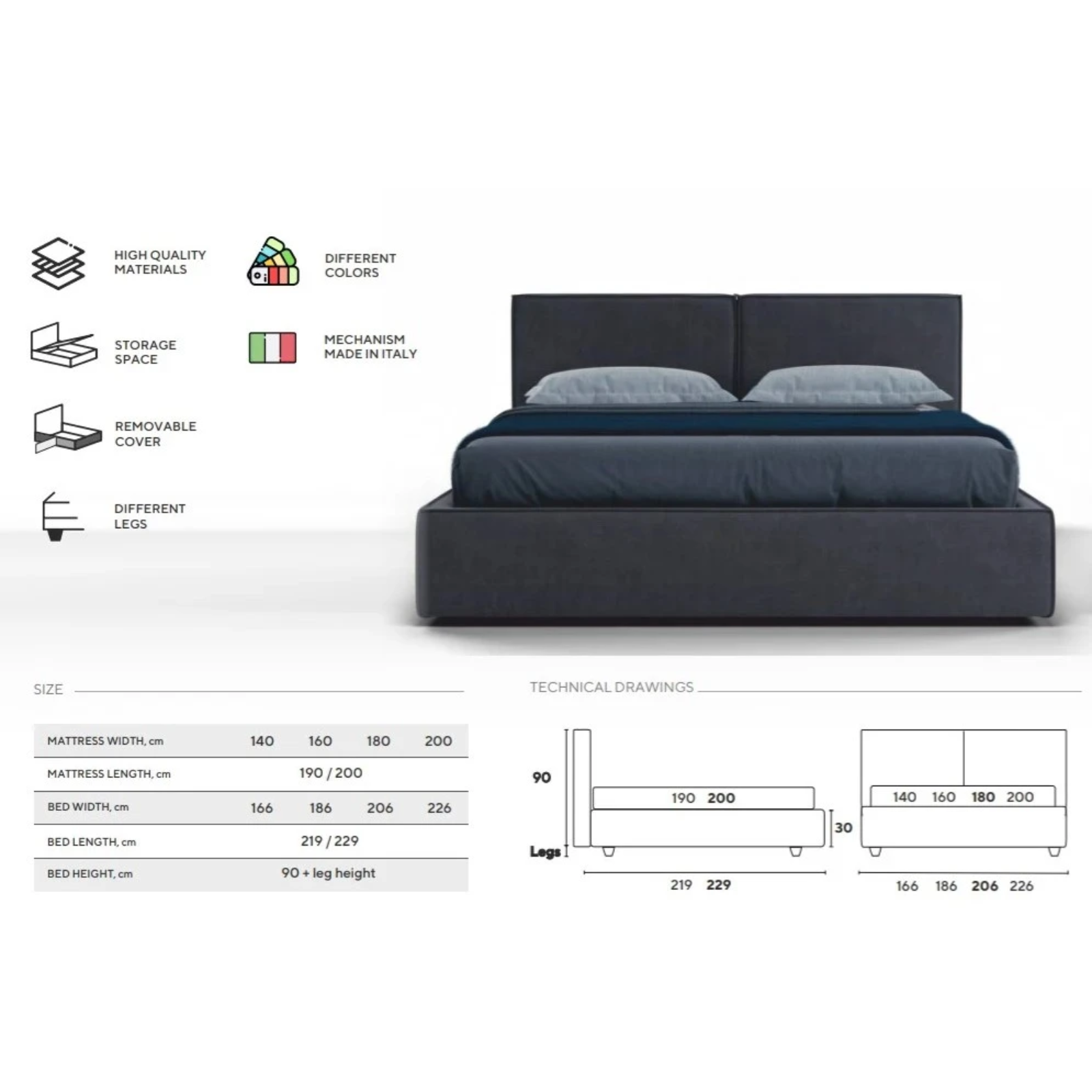 Lungime 190/200 - Adâncimea utilă a spațiului de depozitare: 15 cm;