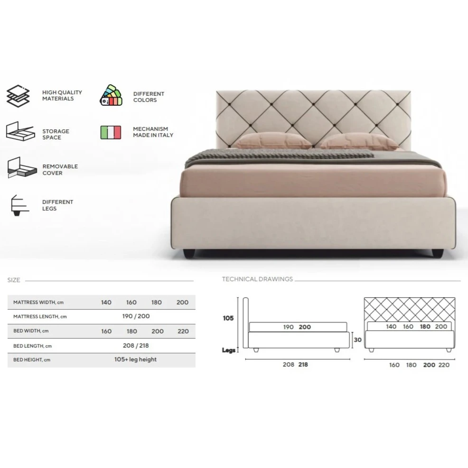 Lungime 190/200 - Adâncimea utilă a spațiului de depozitare: 15 cm;